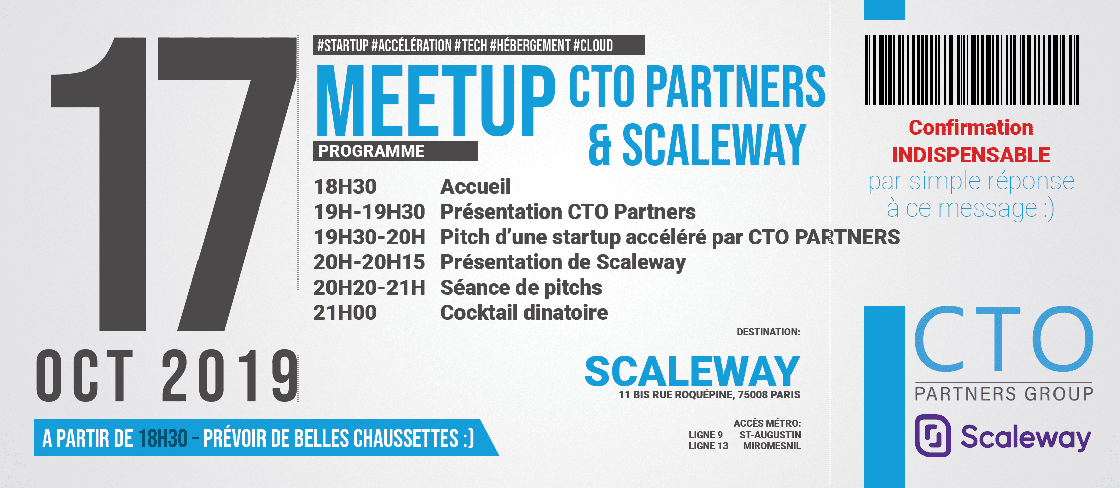 Rejoignez-nous le 17/10 chez ScaleWay pour une séance de présentation du fond, du retour d'expèrience d'une de nos start-up accélérée et de pitch de nouveaux candidats. La séance de présentation et de ptich sera suivie d'un cocktail pour échanger en toute liberté sur les conditions de rentrée dans CTO Partners.